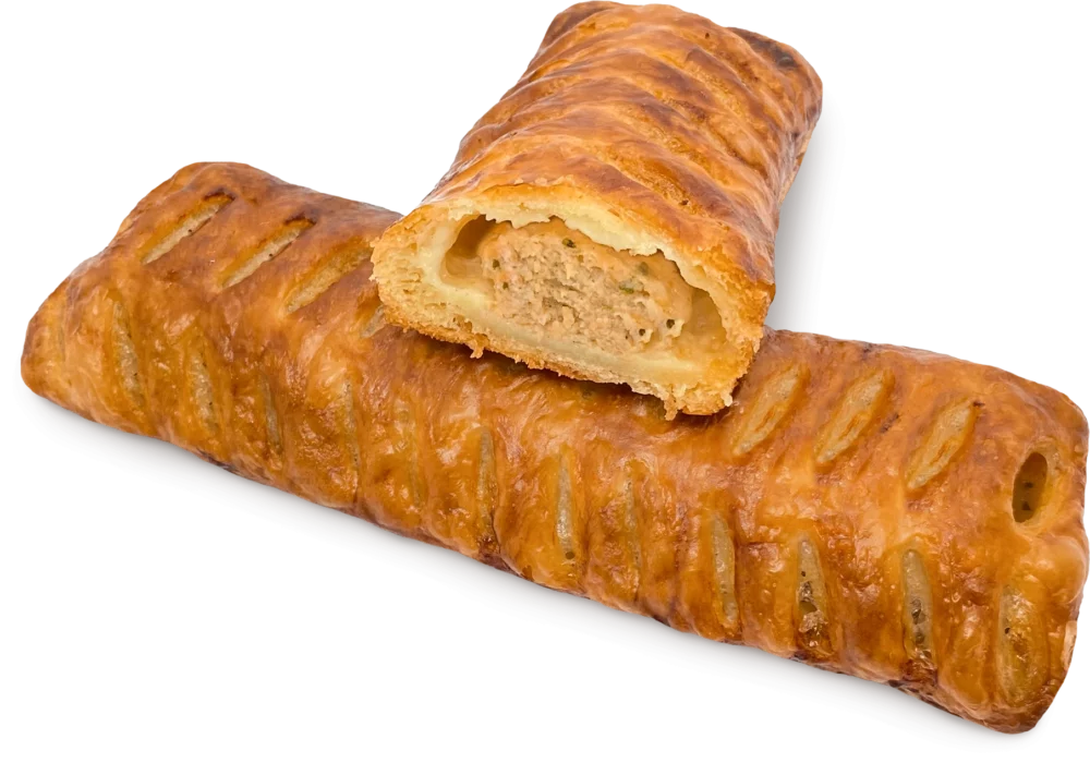 A product made from puff pastry with a filling of minced chicken and a natural mix of oriental herbs, decorated with cuts.