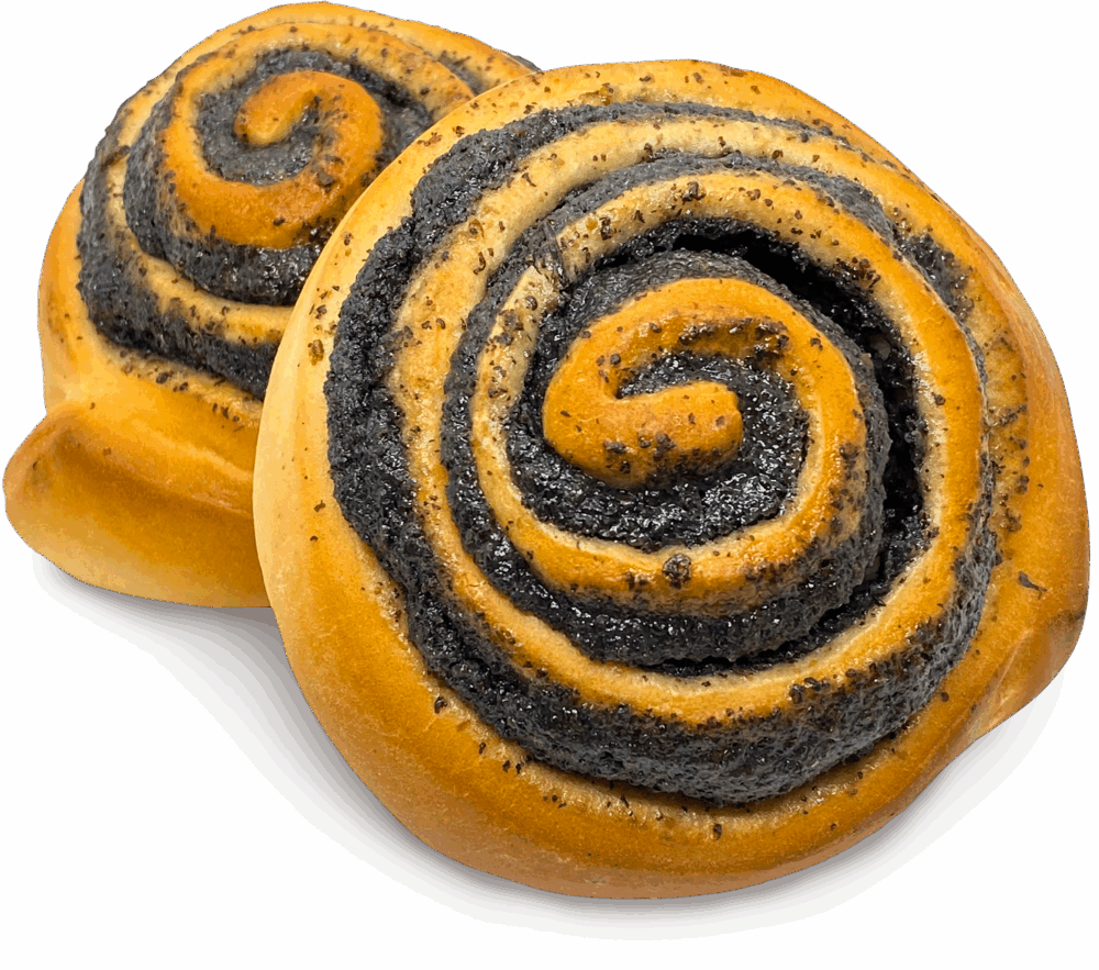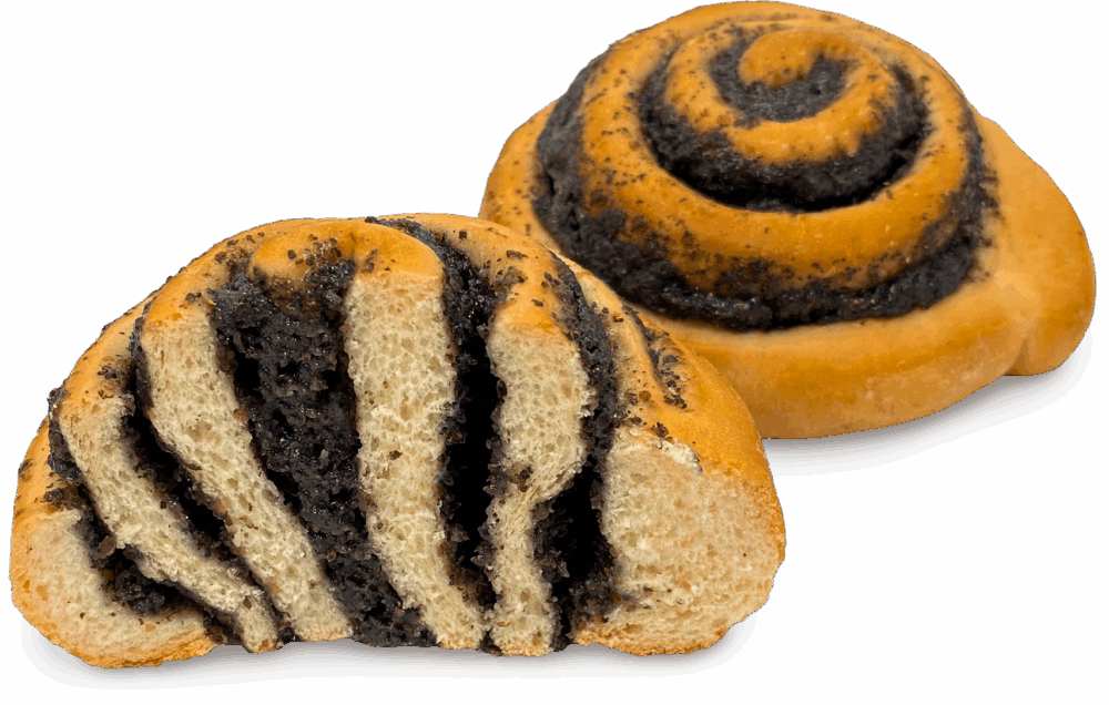 A product made from buttery yeast dough with poppy seed filling, pre-baked and frozen.