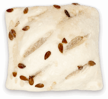 A product made from puff pastry with a filling of ground beef, chicken fillet, fried onions and spices, decorated with sesame and flax seeds.