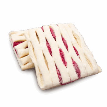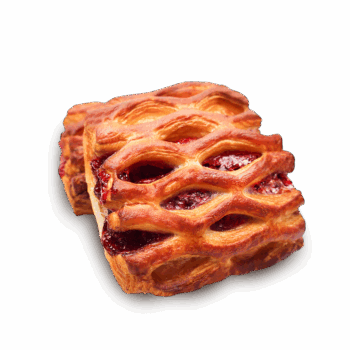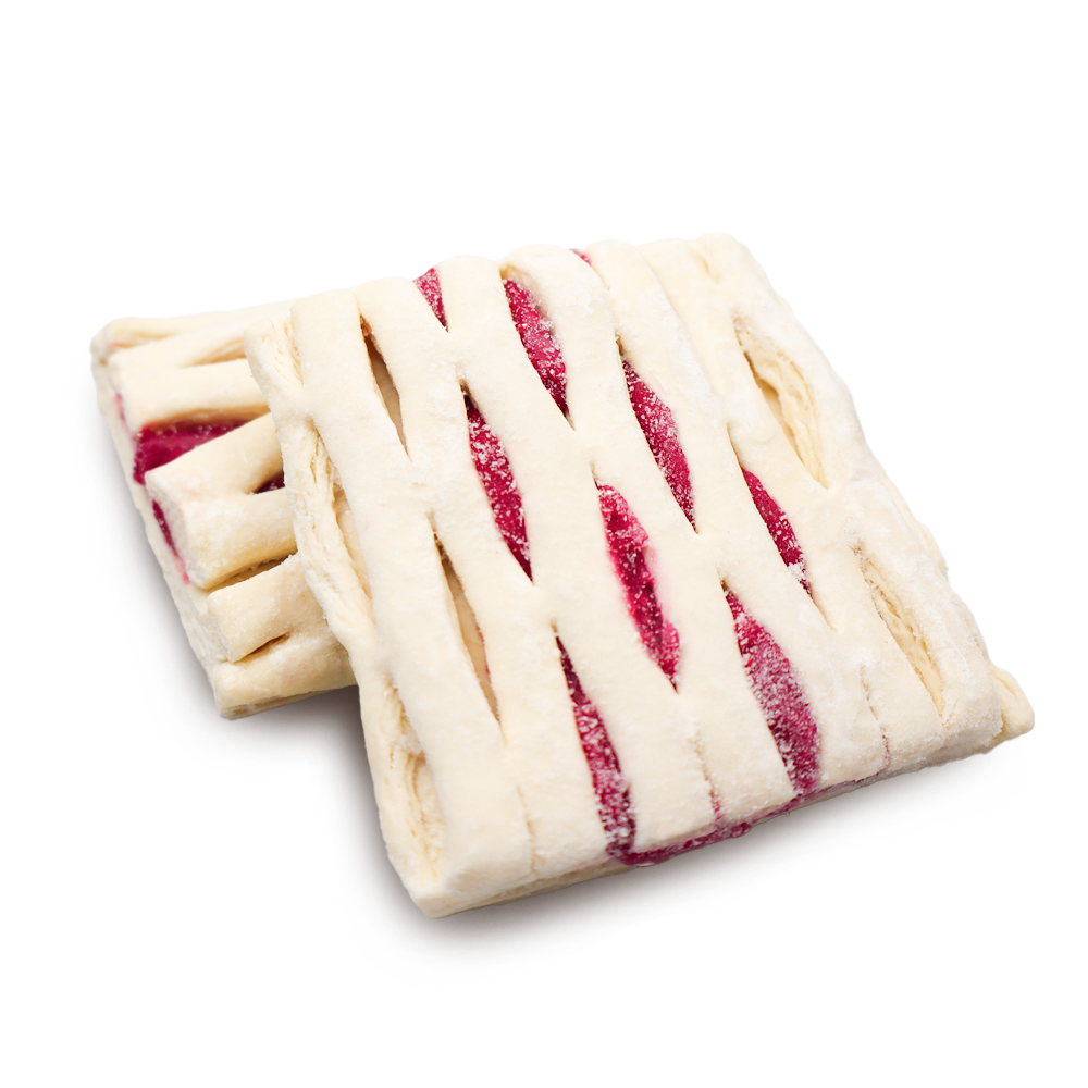 A product made from puff pastry with a filling of freshly frozen raspberries with sugar, decorated with cuts.
