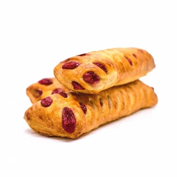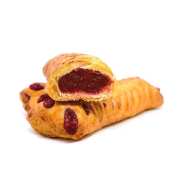 Виріб з листково-дріжджового тіста з начинкою з перетертої полуниці з цукром, декорований надрізами.